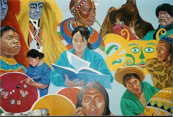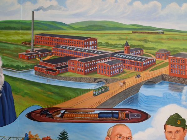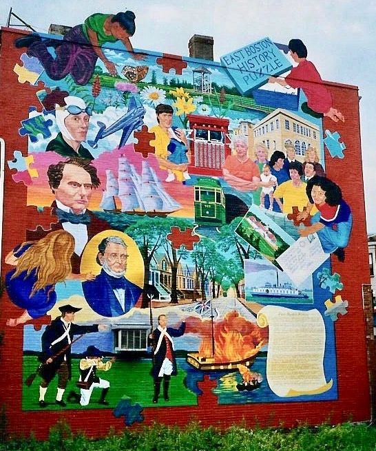 This mural was painted in 1999 to commemorate a group of students responding to an incident on the campus of Bentley University. The mural has become a memorial to students who died in the terrorist attacks on September 11th, 2001.